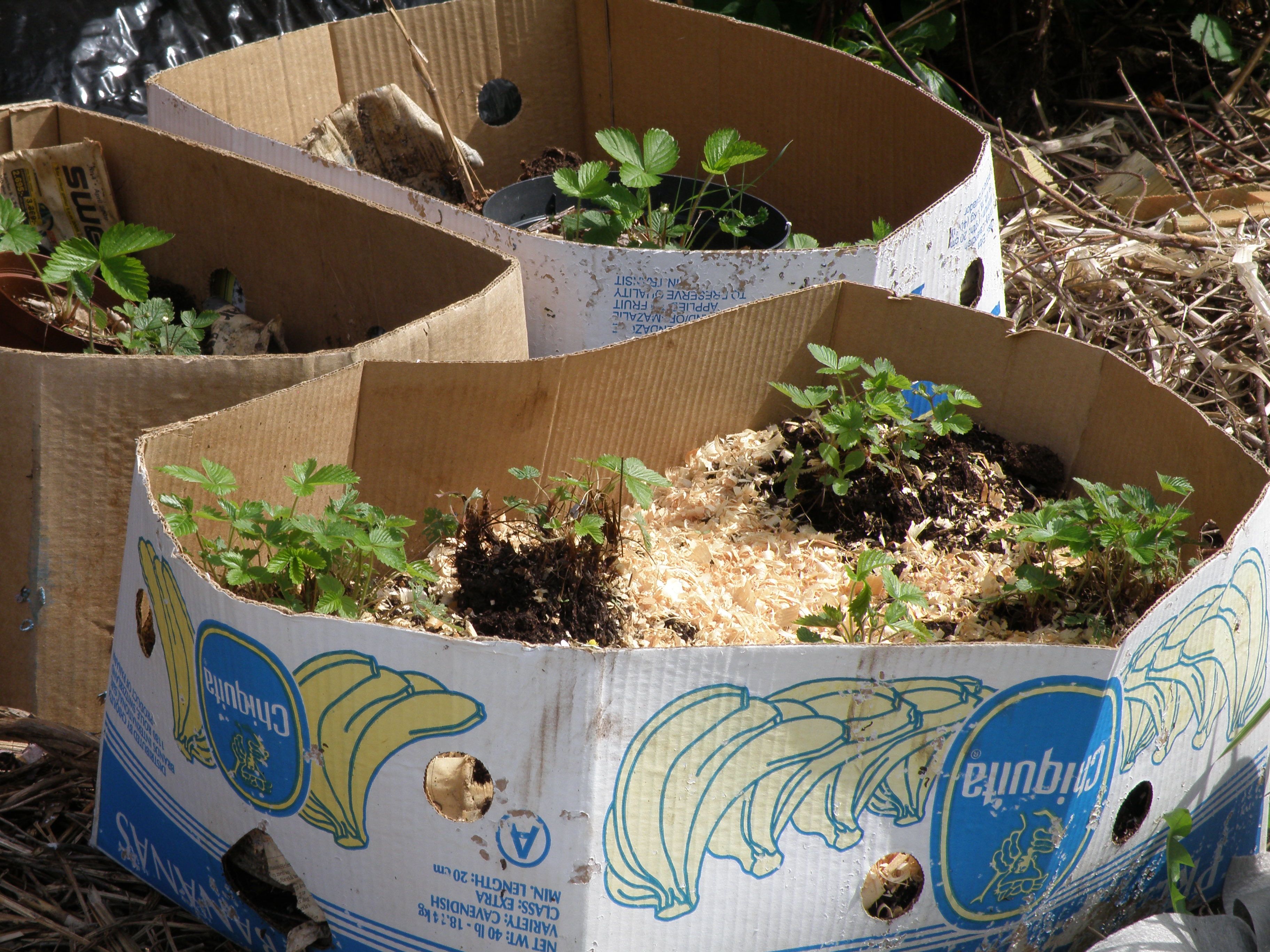 The banana boxes I got hold of had a layer of thin cardboard inside so I left that there to cover the hole in the base. I put some newspaper round the sides to cover some of the other openings in the boxes. Then in with some “old” soil, in with a bucket of Bokashi from the kitchen, and in with a bit of cheap potting mix I had handy. That’s it. Left it a couple of weeks for the pH to balance up then planted some wild strawberries I had handy. My idea is that the Bokashi will do its thing and turn to soil, the boxes will collapse in due course and during the winter the whole thing will spread itself out as a top layer on my new bed.