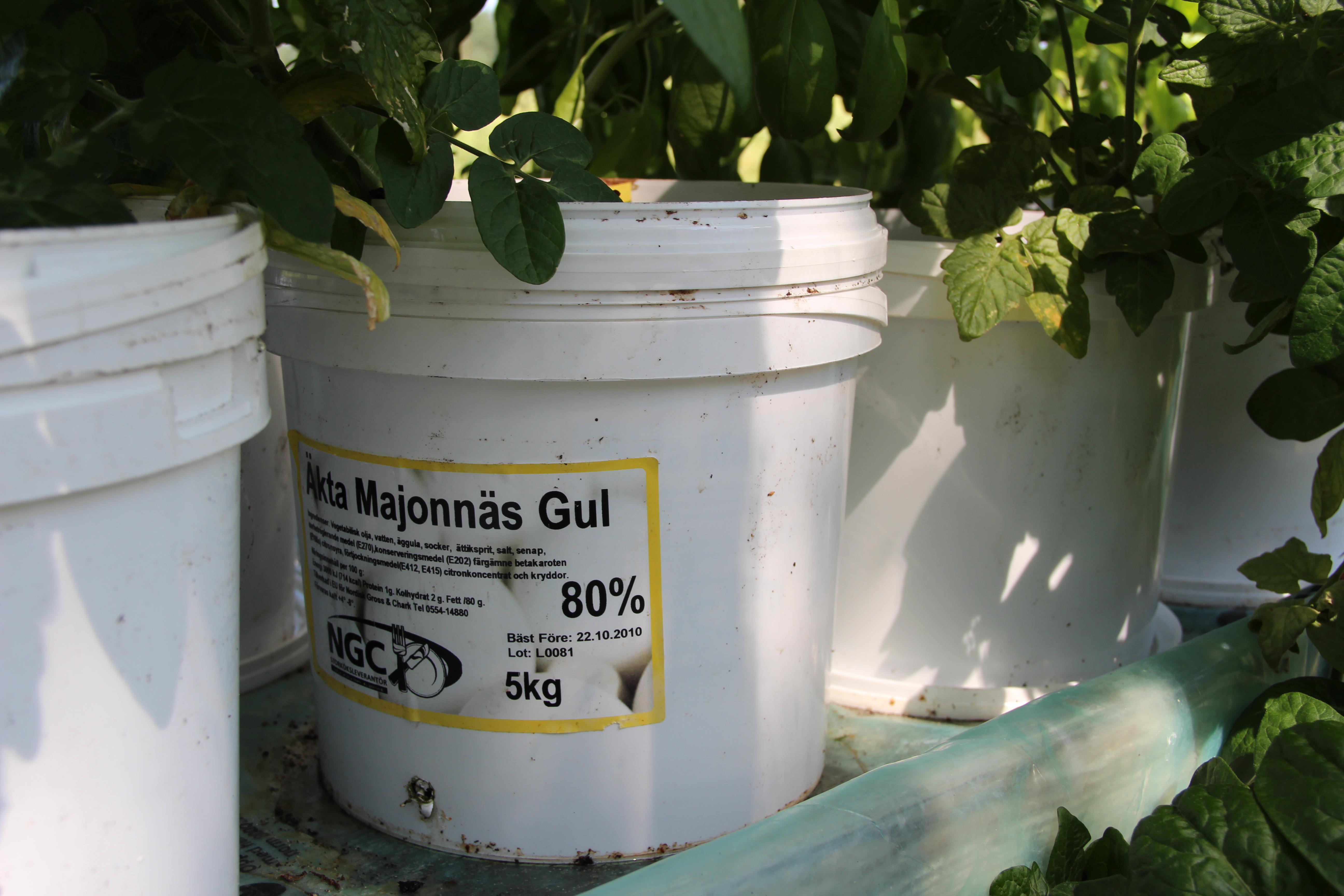 Nevertheless! The tomatoes are growing in a variety of buckets big and small, suits me better than growing straight in the ground. This year I’ve tested a row of smallish buckets (the ones in the pic) for the cherry tomatoes. And they’re working brilliantly.