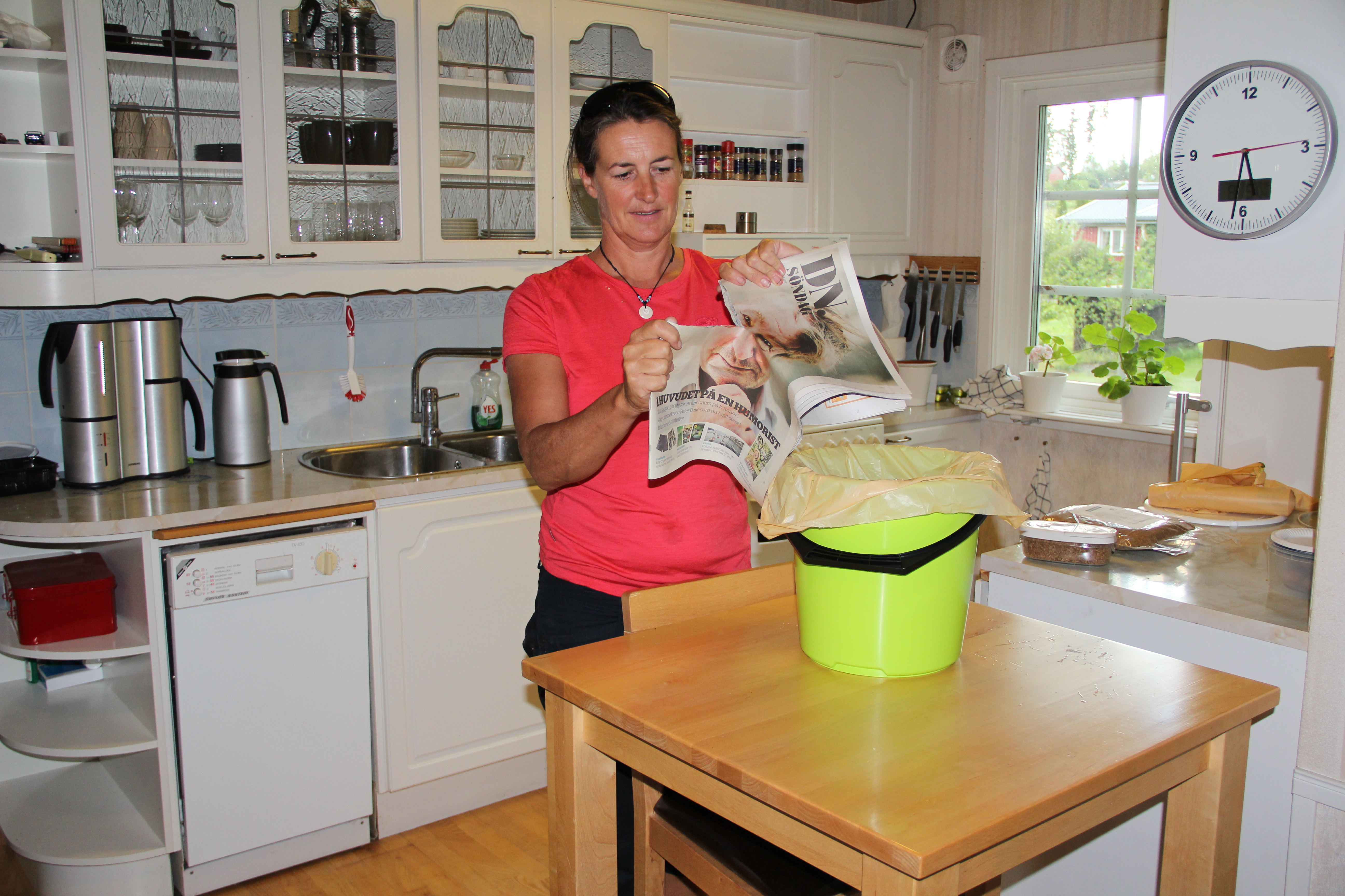 Step one is to put the bag in the bucket just as you would a normal rubbish bag. Then put in some newspaper to take up the liquid that the food waste will produce. You’ll learn pretty quickly how much you need, I usually tear the local paper in two and just plonk it in. If you have wood pellets, hay pellets, cat litter or anything like that on hand you could test it. Anything will work as long it’s cheap and easy to get hold of, will absorb a lot of liquid and you’re happy about having it in your soil.