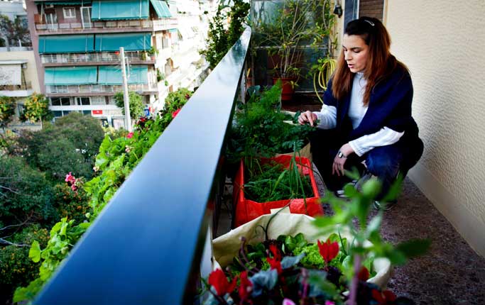 This morning I read an article in our national paper on Greece. Yes, they’re throwing firebombs at one another and protesting up and down in Athens but — one woman’s quiet voice made itself heard. From her balcony. Where she’s started growing veggies outside her parents apartment to feed the family.