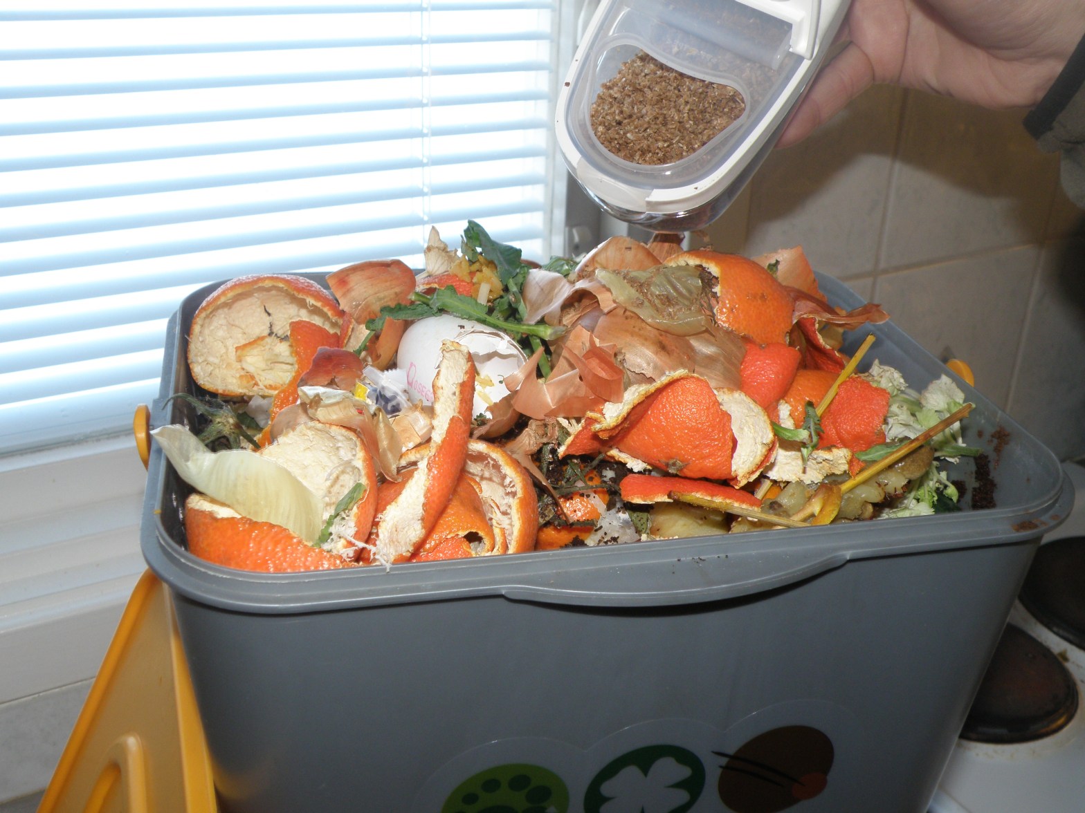 A layer of newspaper on top of the waste in the bin (as you mention) can be really helpful. It’s a handy way of quickly working out how much moisture is in the bin – just look at how soggy the paper is…