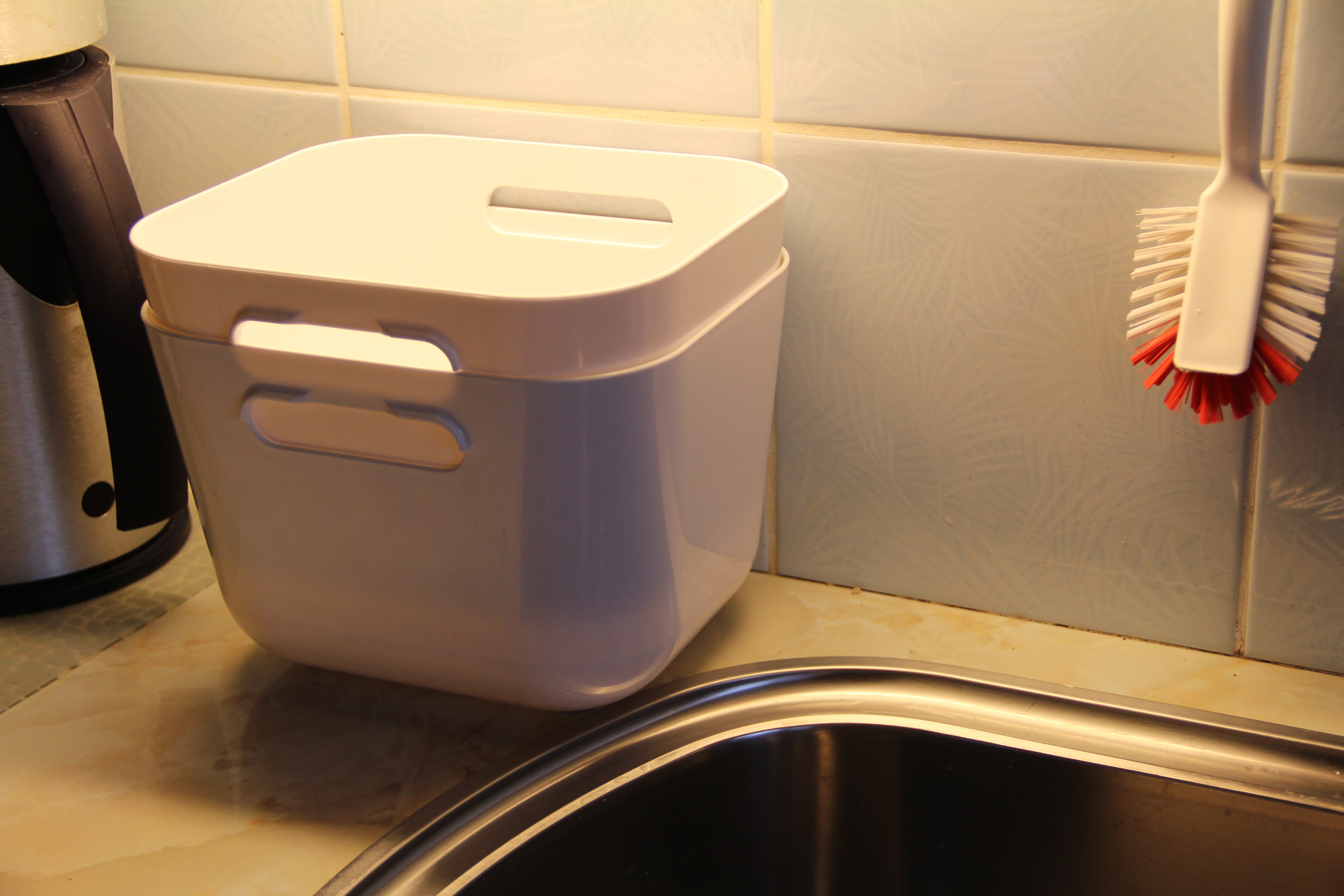 The black one is brilliant to have over your sink. You can peel your potatoes straight into it and let them run off for a while. Let your coffee filters and tea bags stand a while before they go in the bin, makes all the difference if they can dry up a bit.