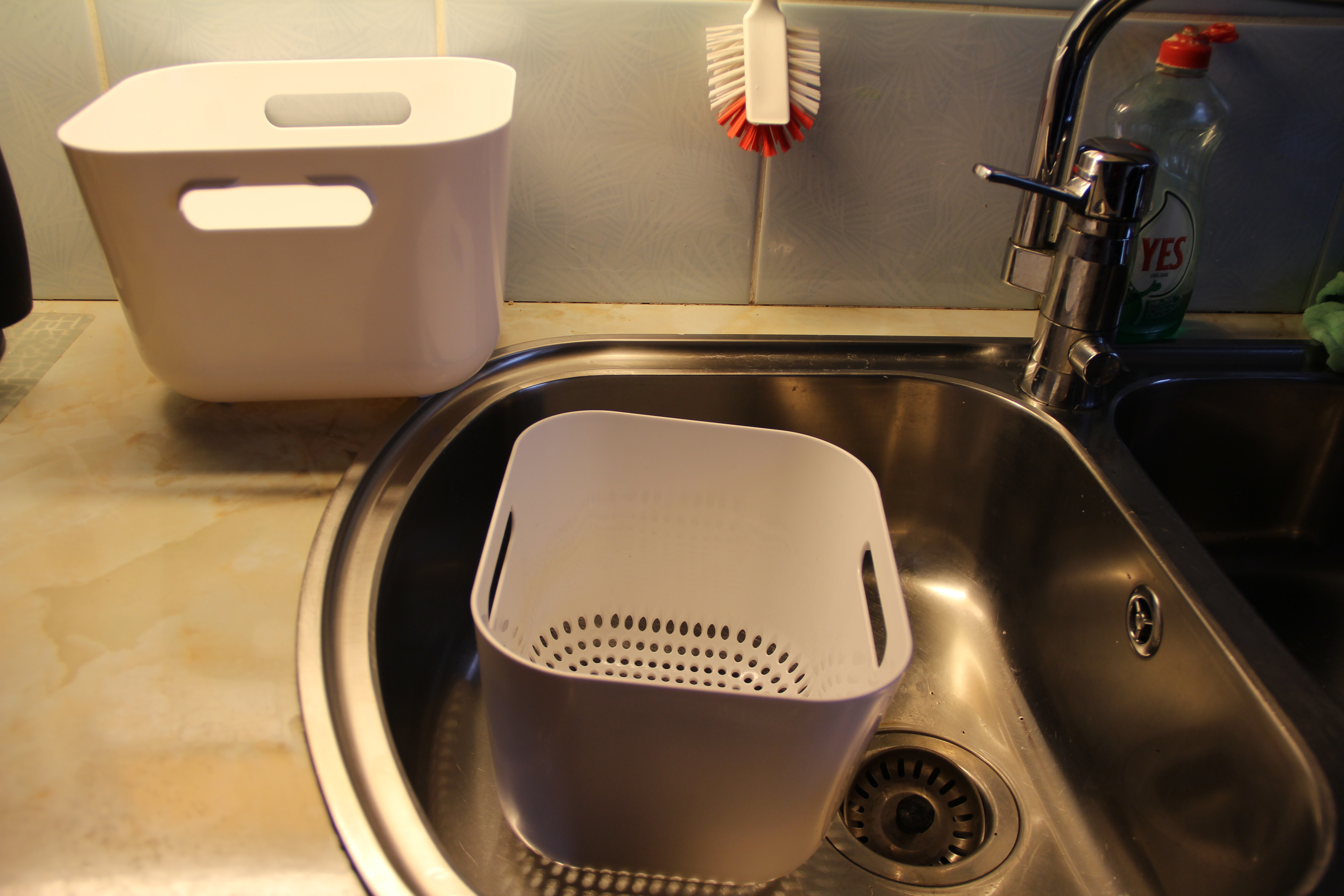 But it’s not so silly to drain off as much of the external moisture as possible before you put things in the bin and let the Bokashi juice come on it’s own in due course from the moisture in the food itself. The pictures show a couple of things I picked up from Ikea recently, here in Sweden they were in the kitchen hardware section, by the recycling bins and the place where they sell kitchen sinks and cupboard doors.