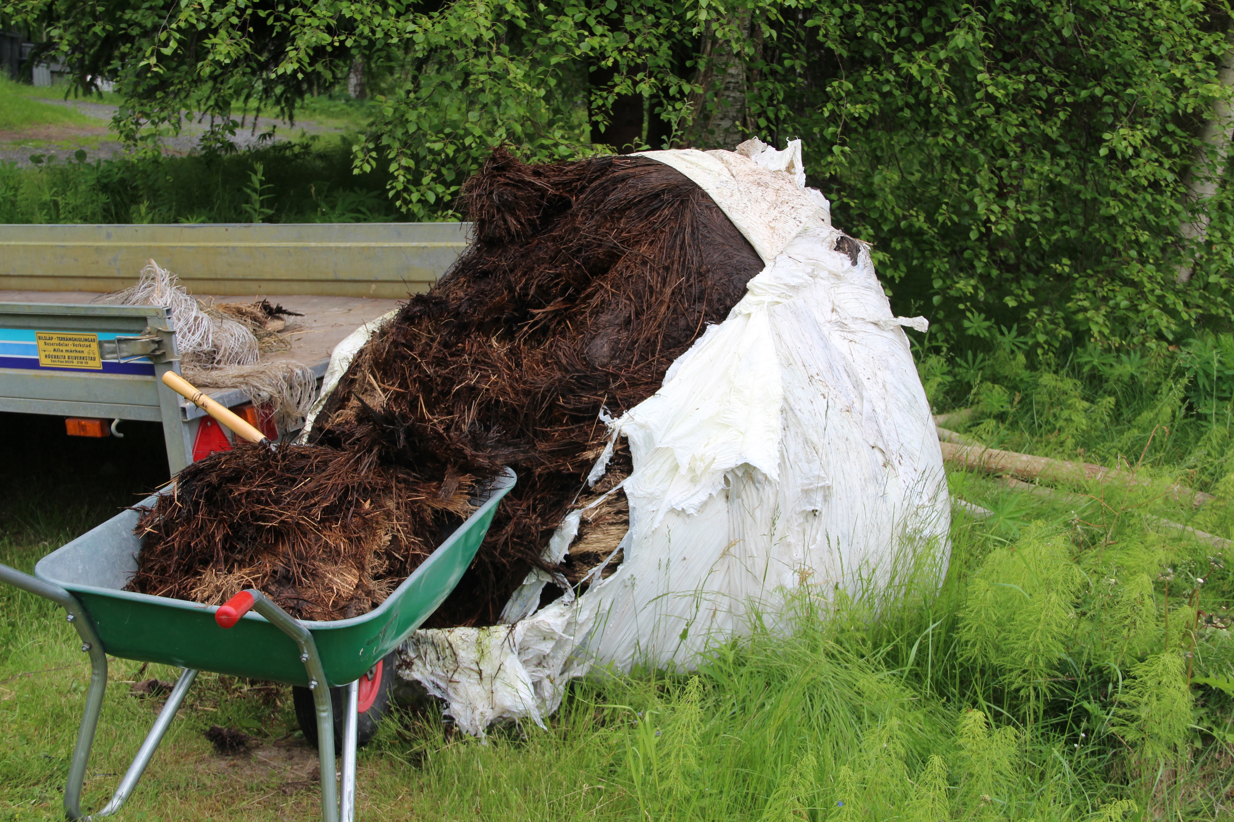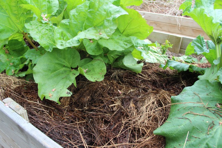 Yesterday the rhubarb bed got a much-needed topup. We have a 5 meter wooden box with some 5 rhubarb plants. The soil has been sinking lower and lower and they haven’t had any real fertilising for some years. I started by spreading out a couple of buckets of Bokashi (would have used more but that was what I had on hand) and then topped it off with a 10 cm layer of hay from the silage bale.